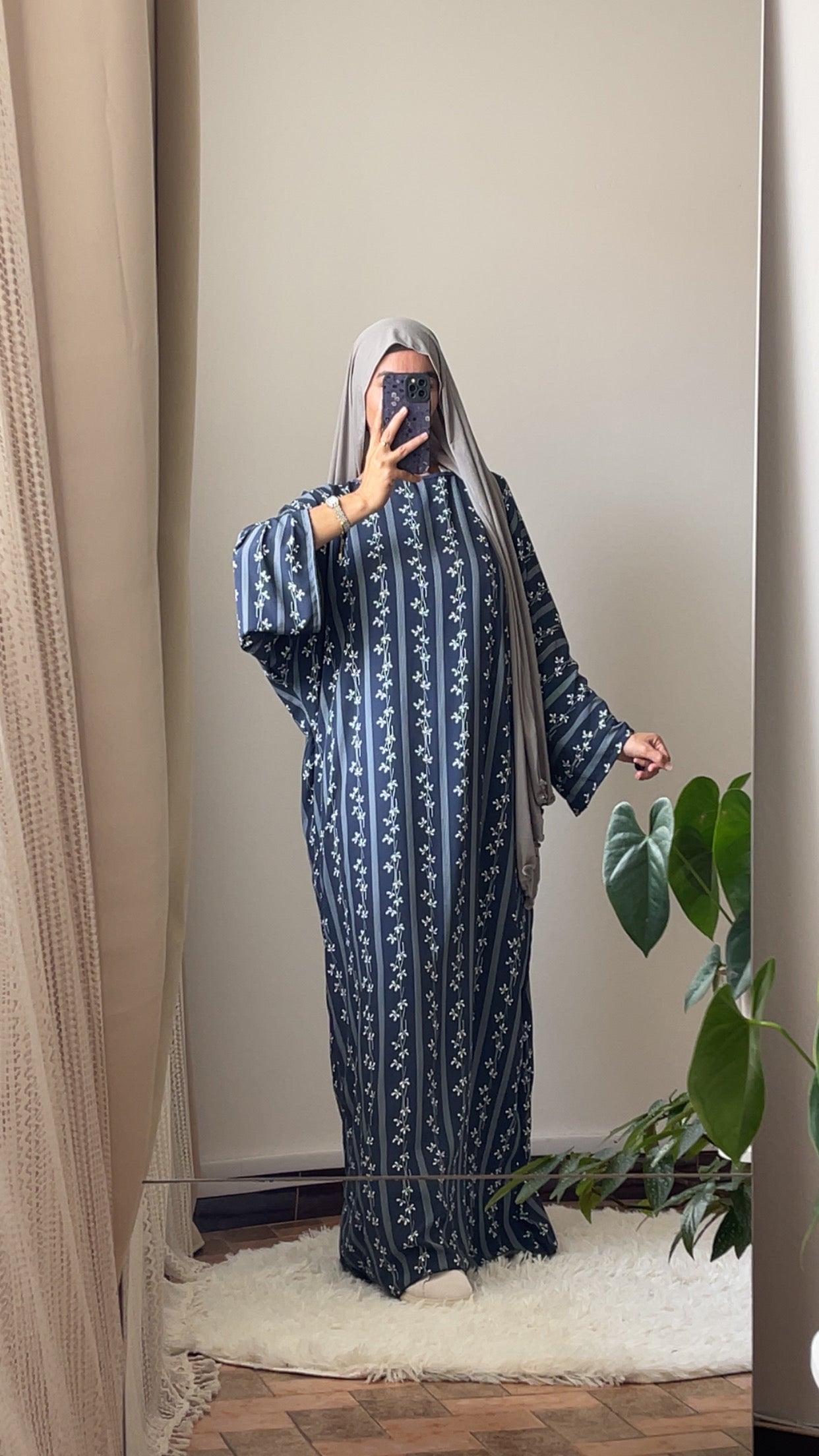 Abaya longue à manches longues, Tissu, crêpes, fluide, non transparente, couleur bleu à motifs blanc Taille unique